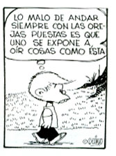 Observemos ahora el oído del hombre: ¡cuántas cosas caben en él! Ya lo decía Felipito, maravilloso personaje de las historietas de Mafalda: traer los oídos siempre puestos tiene algunas desventajas, como estar expuesto a escuchar comentarios de todo tipo. Así, a nuestro oído entran mentiras, verdades, chismes, chistes o simple ruido y éste absorbe los sonidos como si tuviera gravedad y nunca vuelven a salir. Lo que ya una vez escuchaste, no puedes desoírlo jamás. Me consta, yo tengo adentro la música de reggaetón contra todos mis deseos.